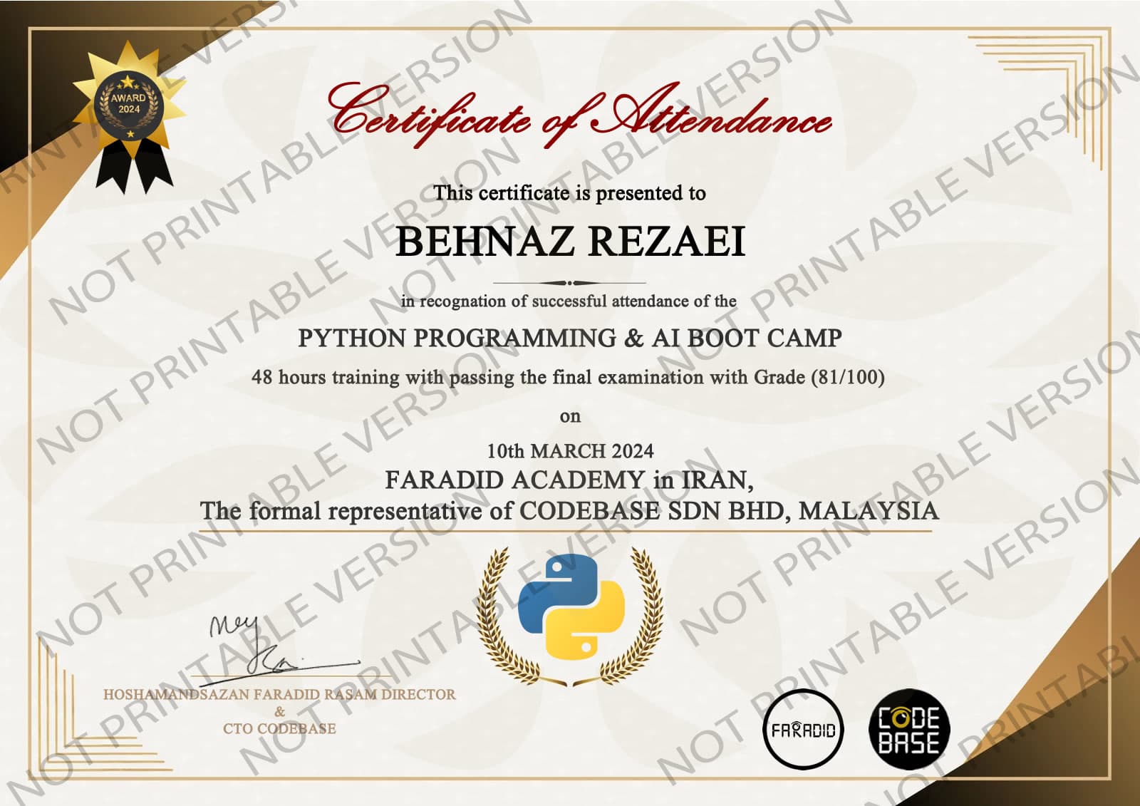 این مدرک نشان‌دهنده گذراندن موفق بوت کمپ آموزشی در فرادید رسام است و مهارت‌های شما را در حوزه مربوطه تأیید می‌کند.