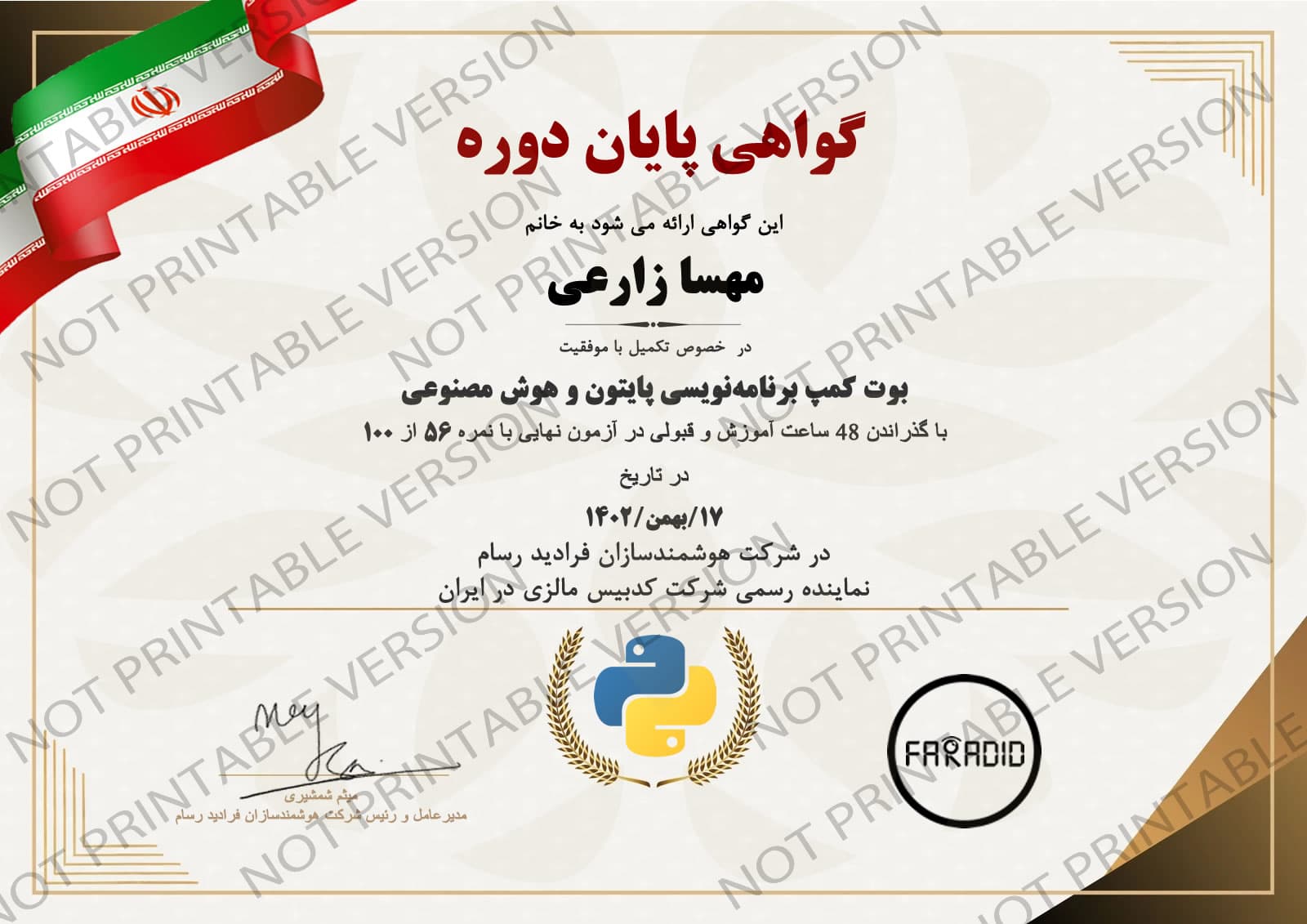 این مدرک نشان‌دهنده گذراندن موفق بوت کمپ آموزشی در فرادید رسام است و مهارت‌های شما را در حوزه مربوطه تأیید می‌کند.