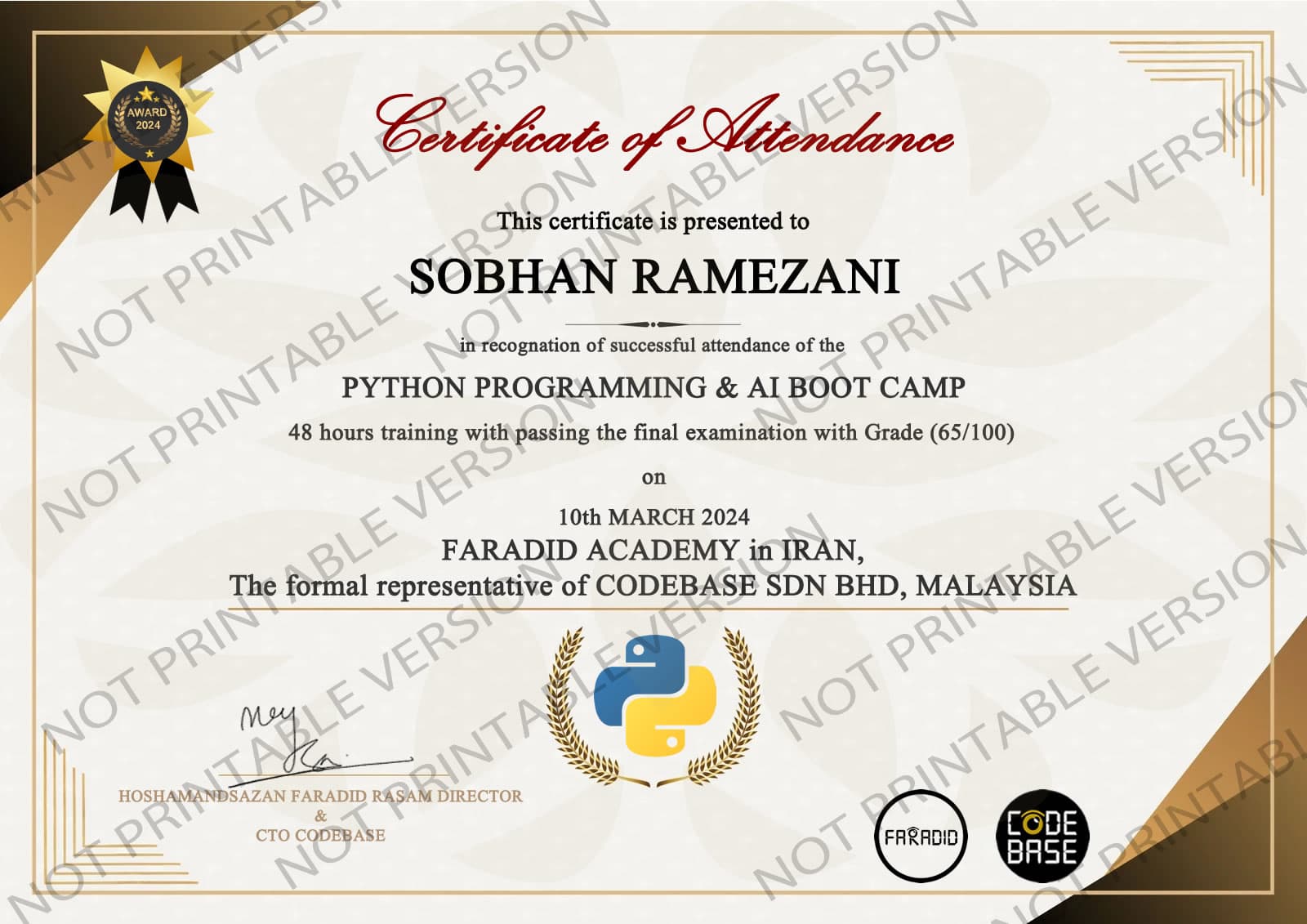 این مدرک نشان‌دهنده گذراندن موفق بوت کمپ آموزشی در فرادید رسام است و مهارت‌های شما را در حوزه مربوطه تأیید می‌کند.
